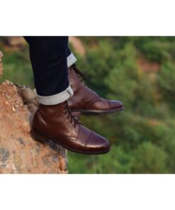 Handmade Brown Leather Cap Toe Ankle Boots for Mens, Men Lace up Ankle Boot