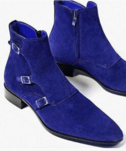 Men’s Blue Jodhpur Triple Monk Strap Dress Office Boots, Real Suede Ankle Business Boots