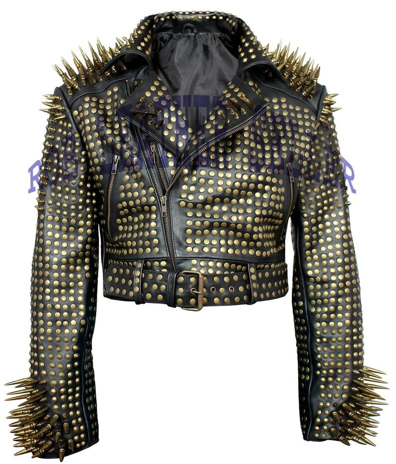 Made To Order Black Brando Belted Leather Jacket Golden Spike Studded Leather Brando Jacket Spiked Men Leather Jacket Gents Biker Jacket